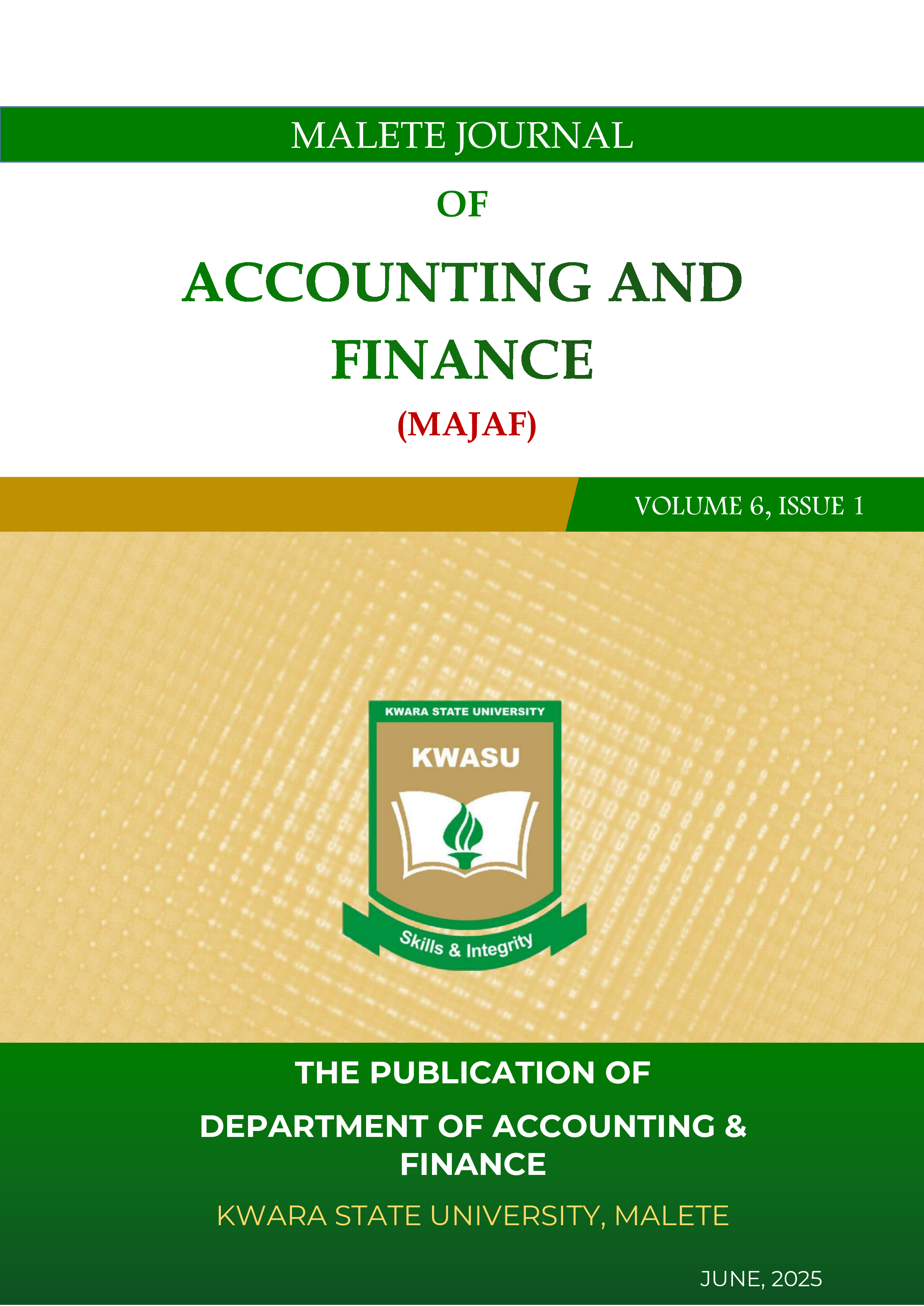 Malete Journal of Accounting and Finance (MAJAF) is an interdisciplinary publication of the Department of Accounting and Finance, Kwara State University, Malete Nigeria. MAJAF is a scientific platform for academic discourse and knowledge advancement for all researchers. The Journal is a double-blind peer review, conceived with a view to creating avenue for academics and professionals in the field of Management and Social Sciences spanning across the disciplines of Accounting, Finance, Economics, Management, Marketing, Entrepreneurship, Business Administration, Political Science, Banking Operations among others, in the dissemination of conceptual, theoretical and empirical knowledge for betterment of humanity at large. The contributions add to the compendium of high-quality research works that do not only contribute to knowledge but also provide technical information and new developments in the fields. The journal is published biannually in June and December.